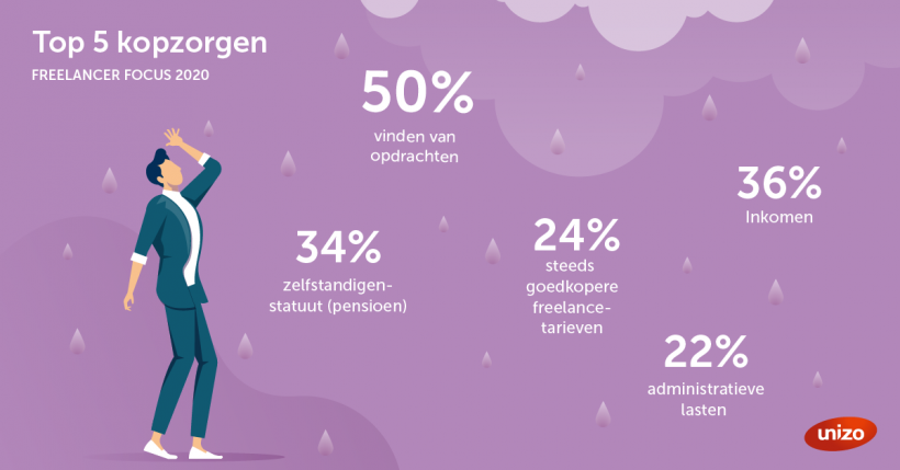 Liggen freelancers dan niet wakker van hun inkomen? Meer dan 36% zegt zich toch zorgen te maken over het inkomen. En die kopzorgen zijn gestegen in 2020 tegenover 2019. Vorig jaar was dit nog 20%. Maar de grootste zorg blijft voor 50% van de freelancers het vinden van freelanceopdrachten en de steeds goedkoper wordende freelancetarieven (24%). En die zorg blijkt niet onterecht.