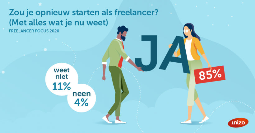 Maar wie dacht dat freelancers in 2020 massaal de handdoek in de ring zouden gooien, heeft het verkeerd voor. Het onderzoek toont alvast aan dat de freelancers resoluut vooruitkijken. Slechts 3% heeft plannen om in de toekomst terug in loondienst te gaan werken. 63% hoopt binnen de 5 jaar nog actief te zijn als freelancer. 19% stelt zelfs een onderneming met personeel voorop. Sterker nog, 85% van de freelancers zegt eenduidig: “Ja, met alles wat ik nu weet, zou ik nog steeds de sprong wagen als freelancer.”