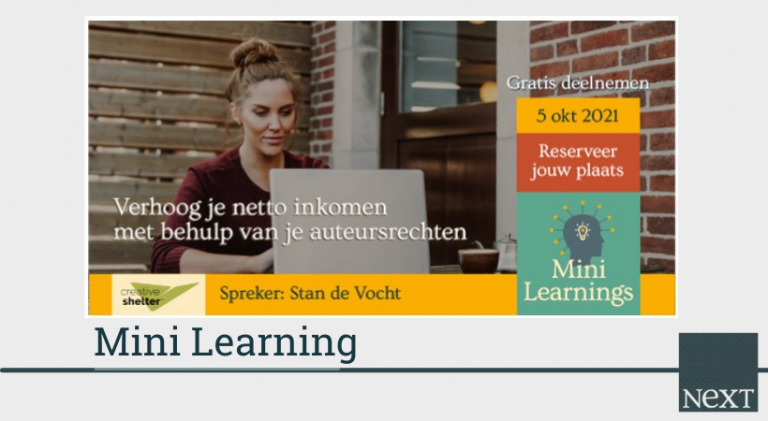 Voor dit webinar op 5 oktober 2021 mag NextConomy rekenen op de expertise van Stan De Vocht van Creative Shelter. Tijdens deze sessie vertelt Stan De Vocht je hoe je als creatieve freelancer met één klik je auteursrechten kan verzilveren. Schrijf je in en ontdek hoe jij meer kan verdienen voor hetzelfde werk op je creatieve opdrachten.