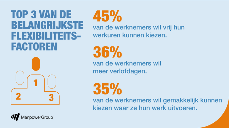 - 45% van de werknemers vrij hun werkuren wil kunnen kiezen;