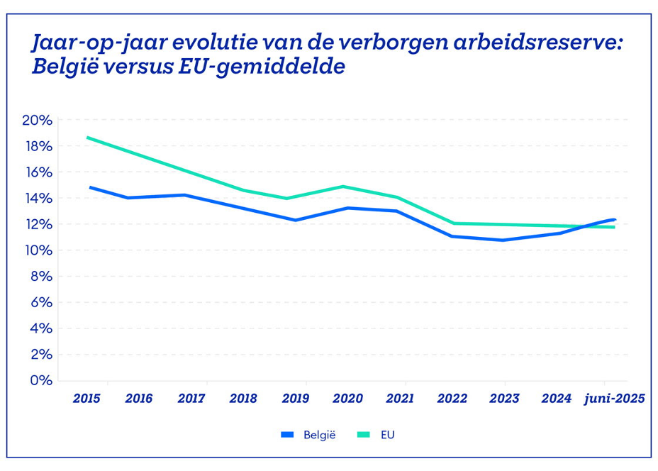 Voor het eerst in tien jaar ligt de ‘verborgen arbeidsreserve’ in België hoger dan het Europees gemiddelde (11,7%). 1 op de 8 Belgen (12,1%) benut zijn of haar talent niet volledig op de arbeidsmarkt. Het gaat om verschillende groepen: mensen die werkloos zijn, mensen die deeltijds werken maar meer uren willen, mensen die beschikbaar zijn voor werk zonder actief te solliciteren, of mensen die wel zoeken maar niet onmiddellijk beschikbaar zijn. Vooral vrouwen en jongeren blijven ondervertegenwoordigd. Dat blijkt uit een analyse van hr-dienstverlener Acerta op basis van cijfers van Eurostat.