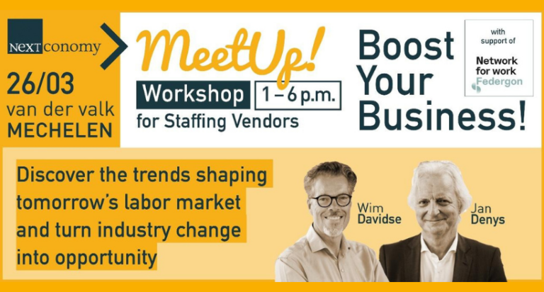 Op 26 maart 2026 organiseert NextConomy een exclusieve workshop voor staffing vendors. Tijdens deze studienamiddag gaan de arbeidsmarktexperten Jan Denys en Wim Davidse in op de belangrijkste trends die de sector vandaag vormgeven, én op de vraag hoe je daar als arbeidsmarktbemiddelaar of HR-dienstverlener strategisch op kunt inspelen.