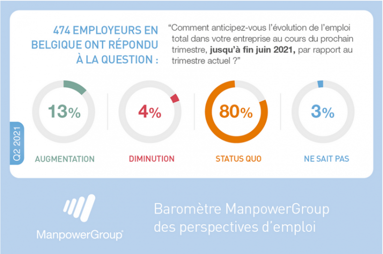 Selon le Baromètre de ManpowerGroup la situation sur le marché de l’emploi devrait continuer à s’améliorer au cours du 2e trimestre 2021. En Belgique, 13% des 474 employeurs sondés fin janvier prévoient de renforcer leurs effectifs d’ici la fin du mois de juin 2021, tandis que 4% d’entre eux prévoient de les réduire. 80% des employeurs interrogés n’anticipent aucun changement.